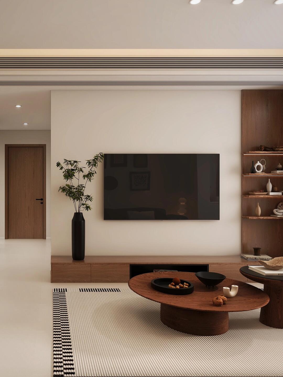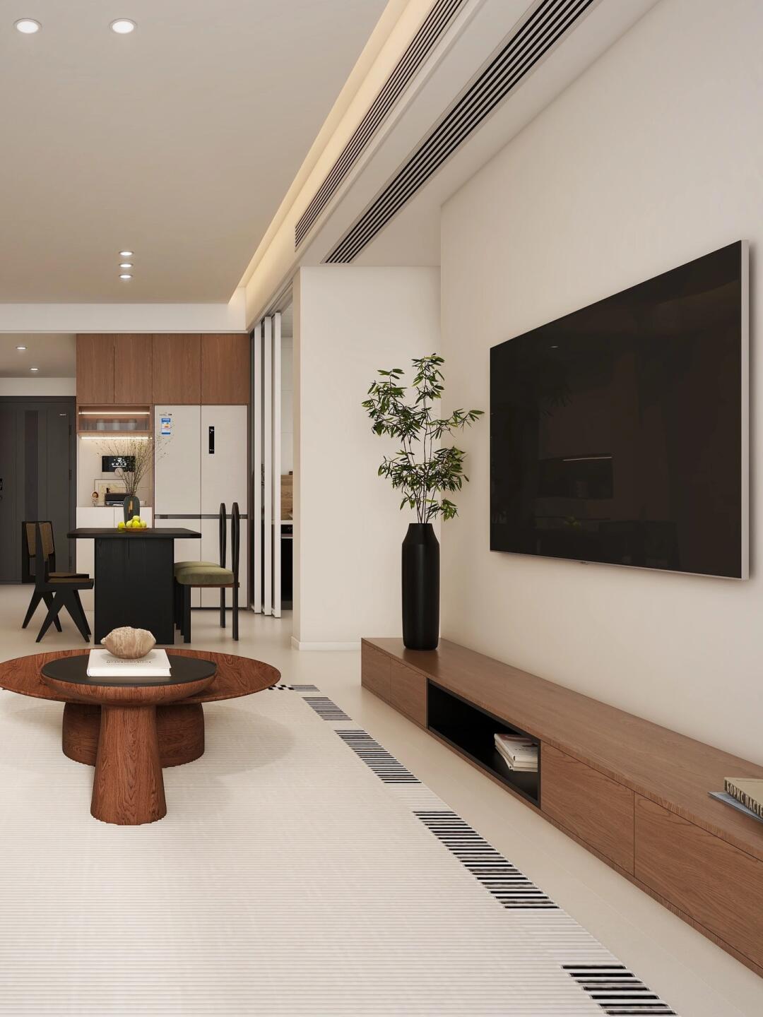 客廳地面通鋪暖色柔光磚,以大地色系的暖調(diào)營造沉靜的美感,