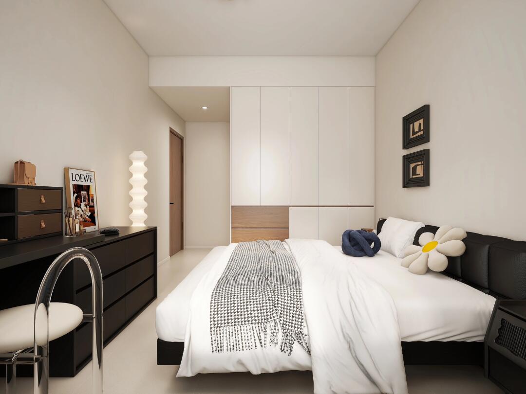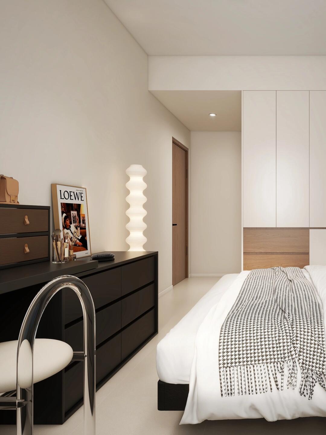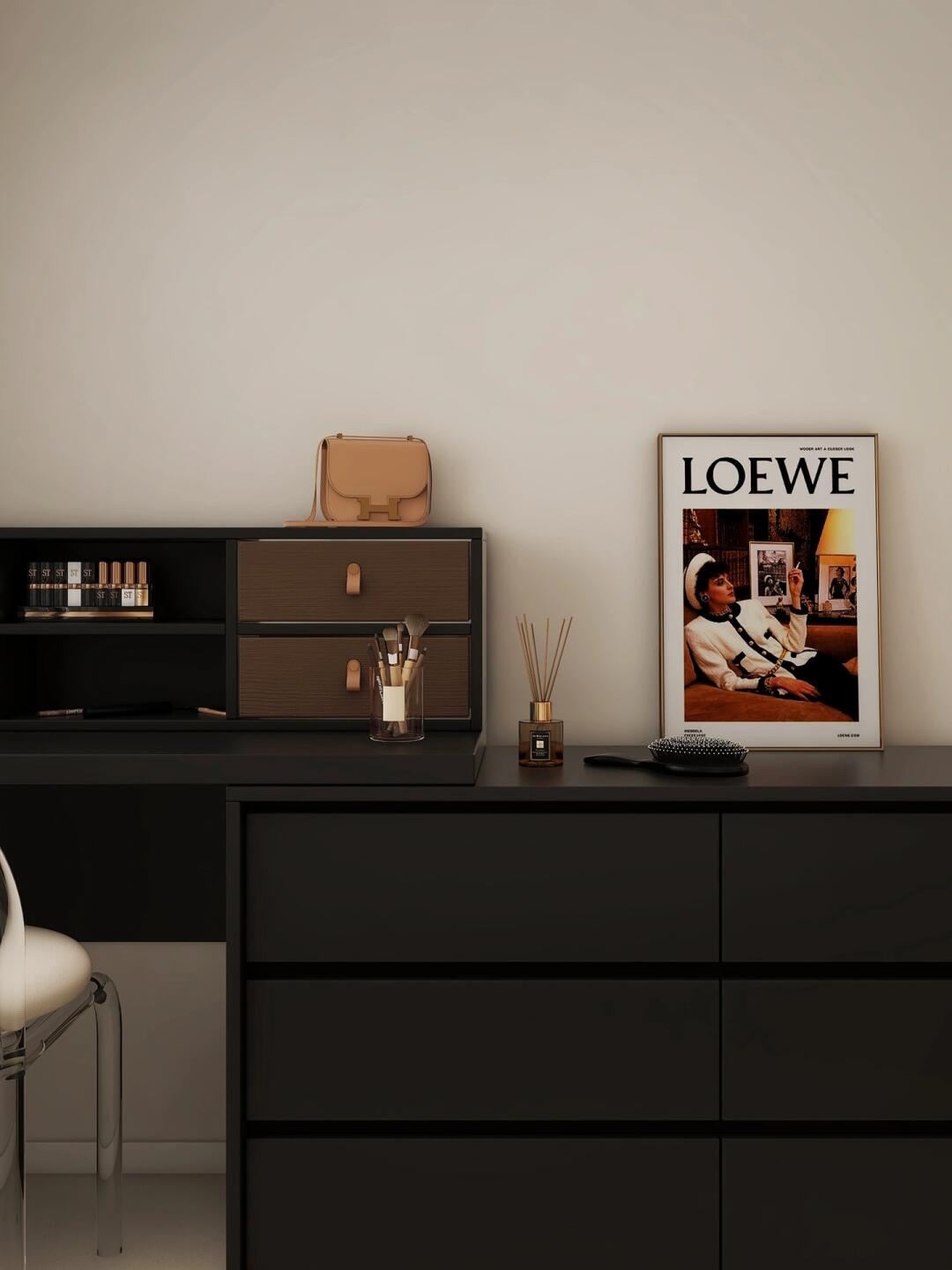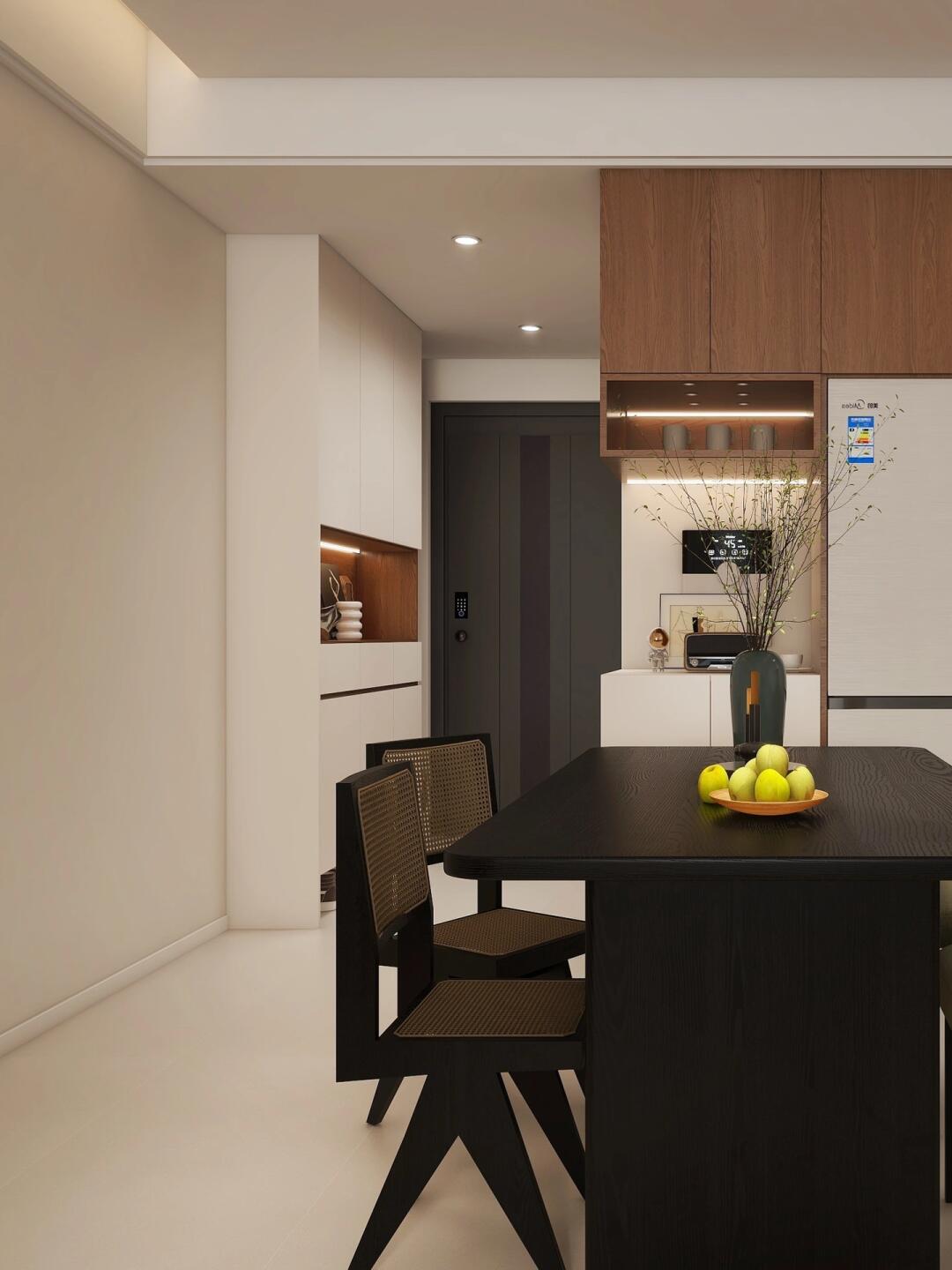 淺色的柜門、胡桃木色的柜體和成品家具,點(diǎn)綴黑色元素,提升質(zhì)感,深淺有變化,高級不失復(fù)古腔調(diào)。