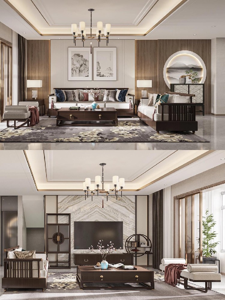以米色為主色調,選用咖色飾品作為點綴,柜體采用木飾面搭配玻璃材質,以金屬線條收邊。