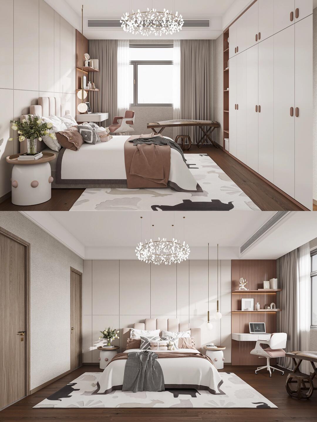 主臥室在飾品的選用上同樣以簡約風格為主,咖色床品搭配木飾面的床頭高背景墻。