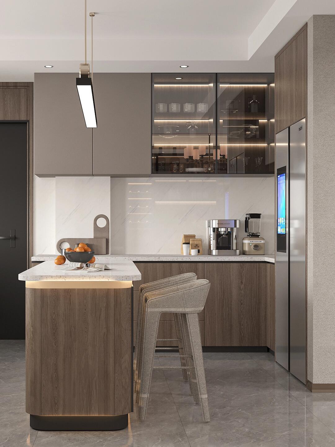 灰色主沙發搭配咖色抱枕,定制的大理石材質島臺與廚房完美銜接。
