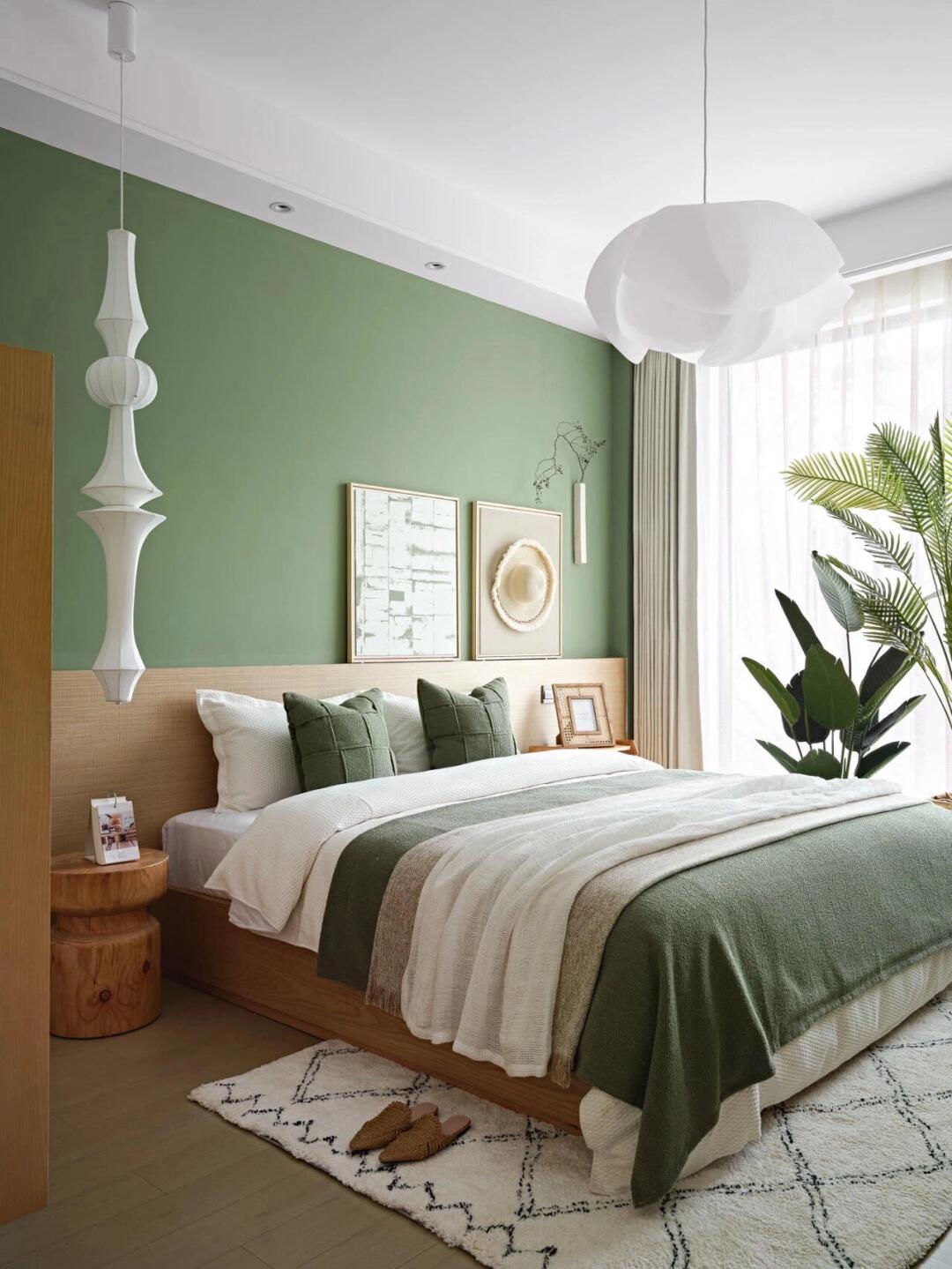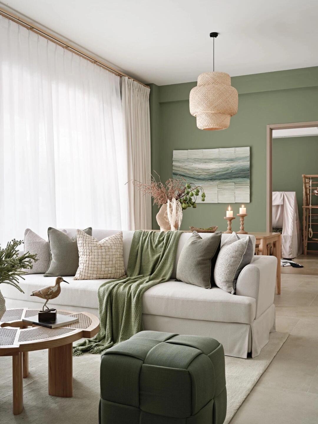 在客廳空間內布局了大量的綠色家具、物件,墻壁的顏色也選用森林綠,