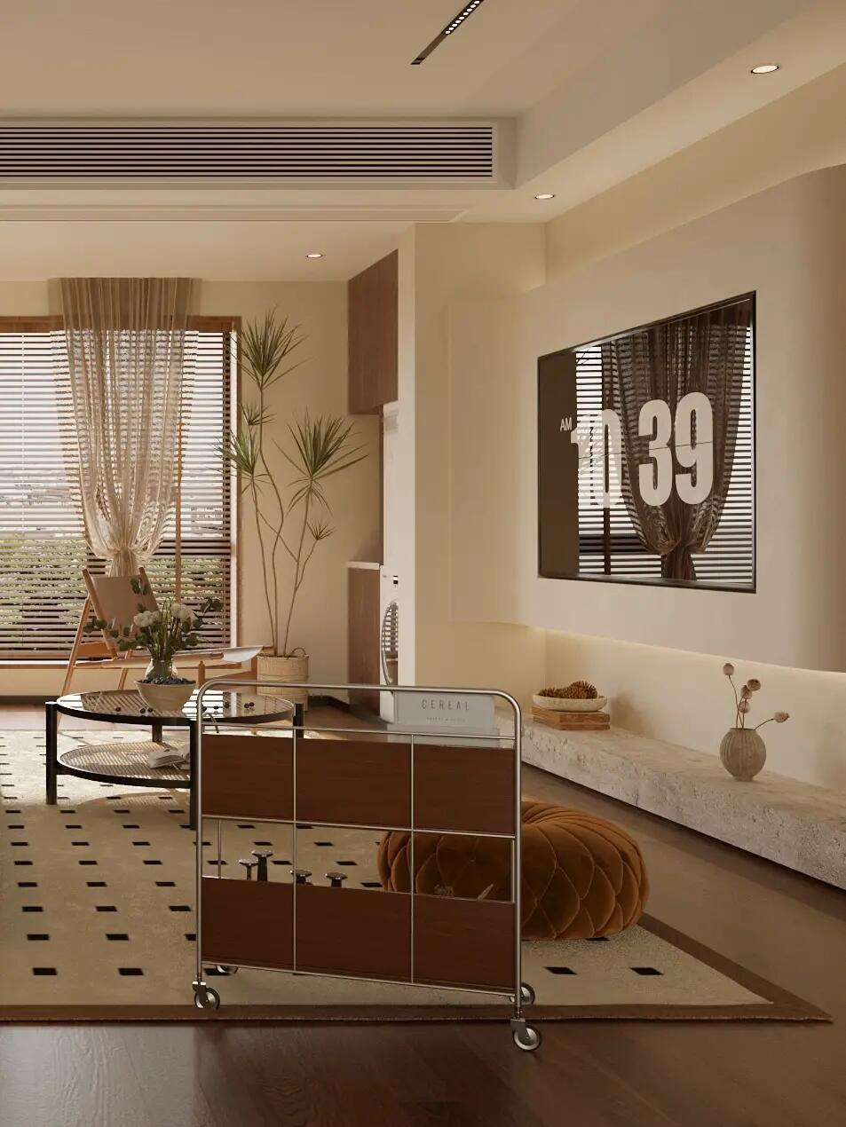 墻面滿刷奶油黃的藝術乳膠漆,色調優雅沉穩,仿佛時光在溫柔中緩慢流淌